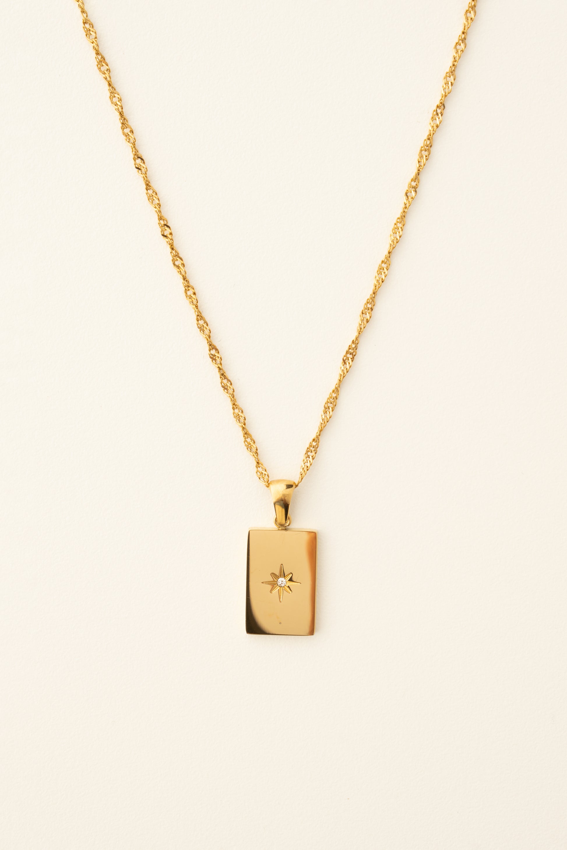 The Athina Make a Wish Square Star Pendant Necklace showcases a gold wishing star with a simulated diamond center, elegantly set in a stunning gold-glimmering pendant. Wear this piece and make a wish.