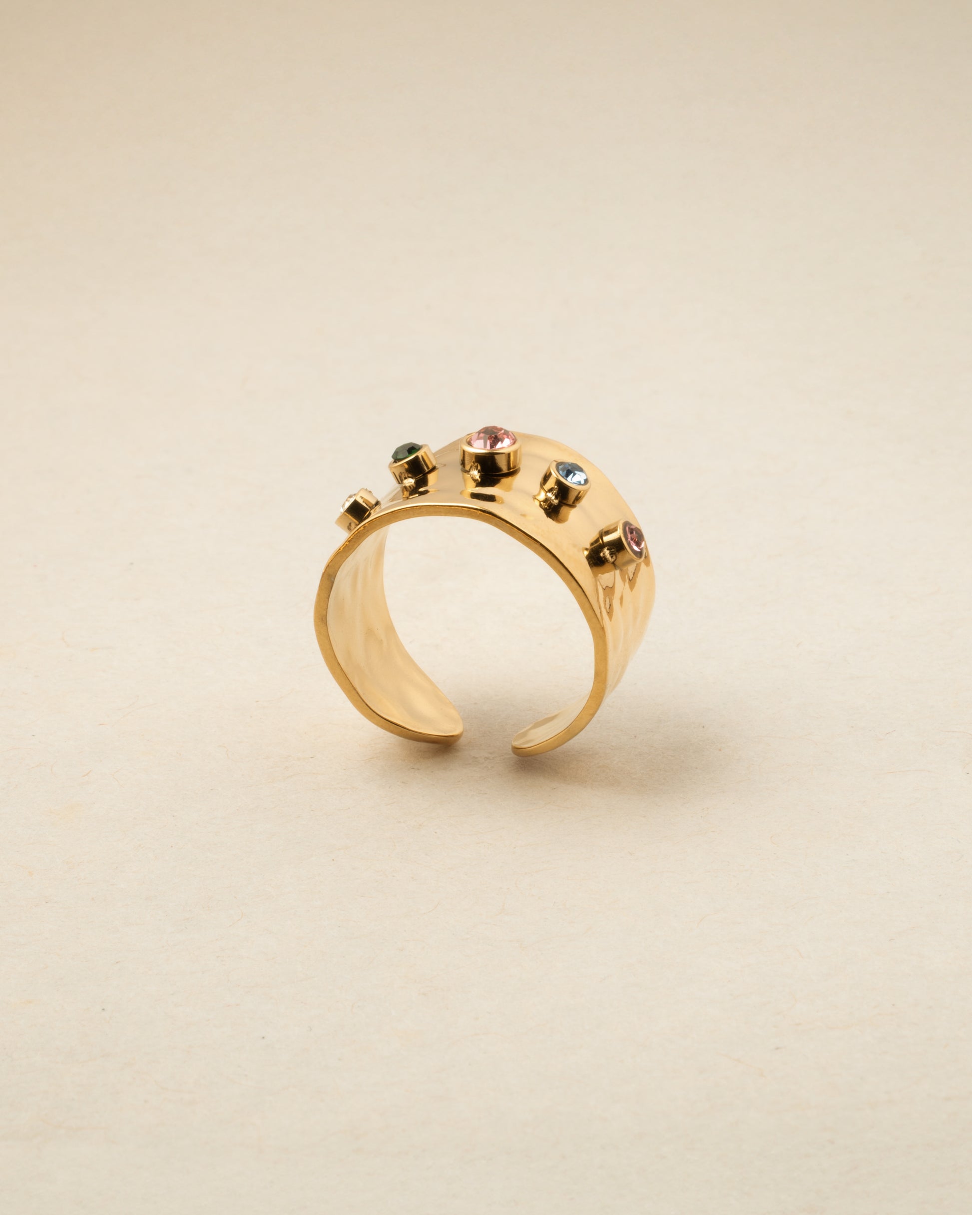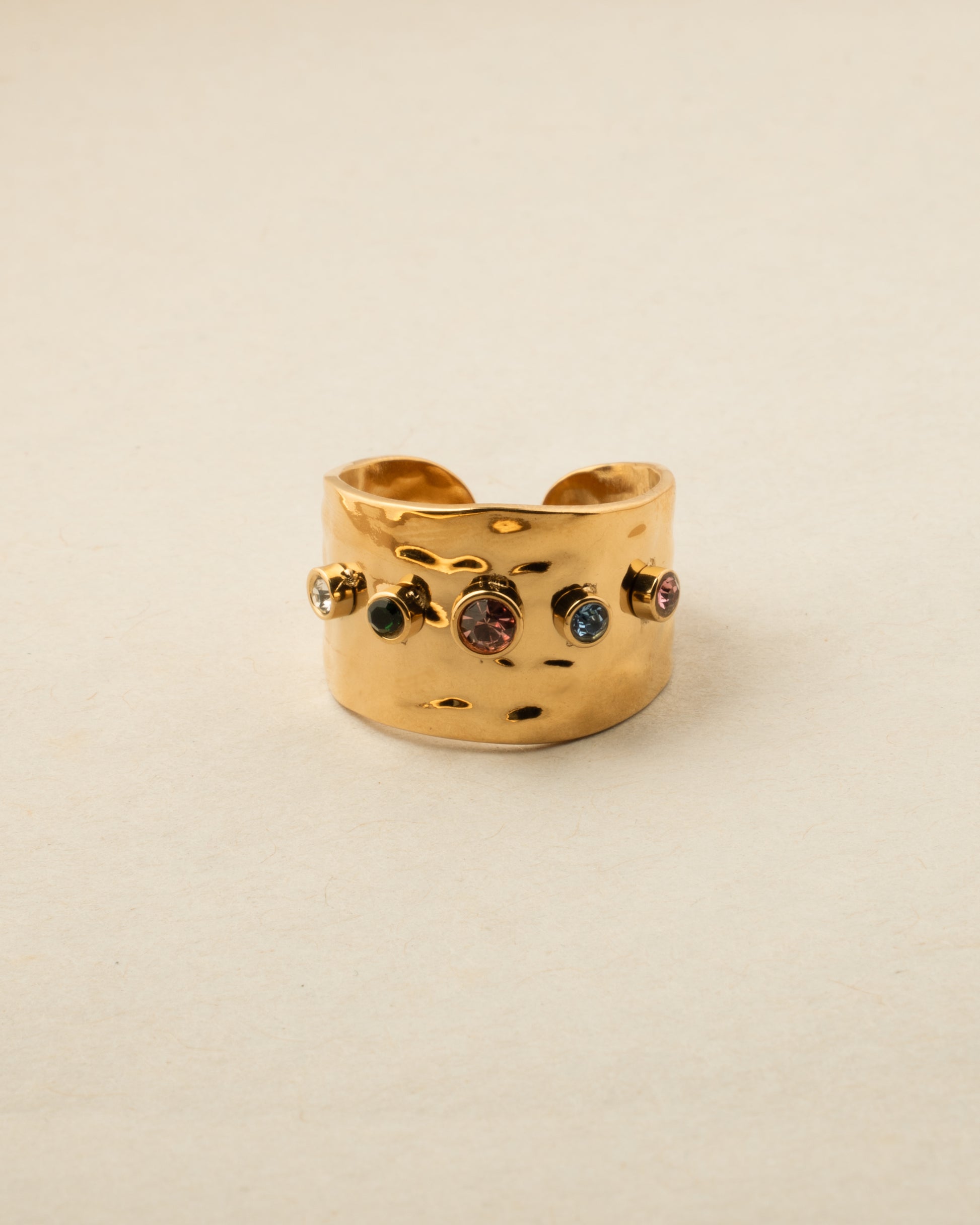 Make a statement with this bold ring showcasing a dazzling array of cubic zircon crystals. Crafted from waterproof stainless steel and finished with 18K gold, it combines durability with vibrant style.