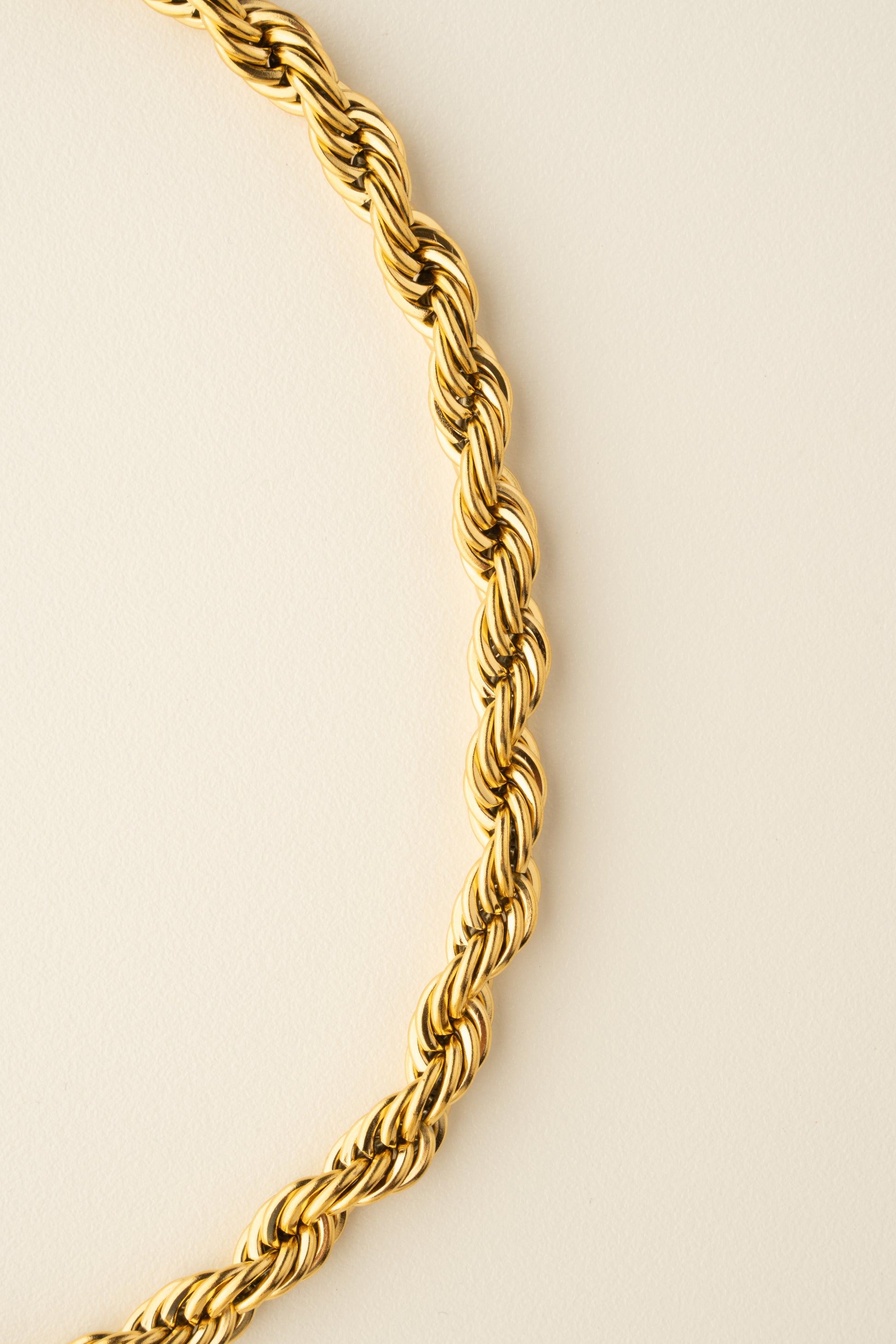 The Golden Torque necklace is crafted from premium stainless steel and finished with durable 18K PVD gold plating for lasting shine and strength. Its chunky rope chain design brings confident style and timeless luxury to any look—perfect for layering or making a solo statement.
