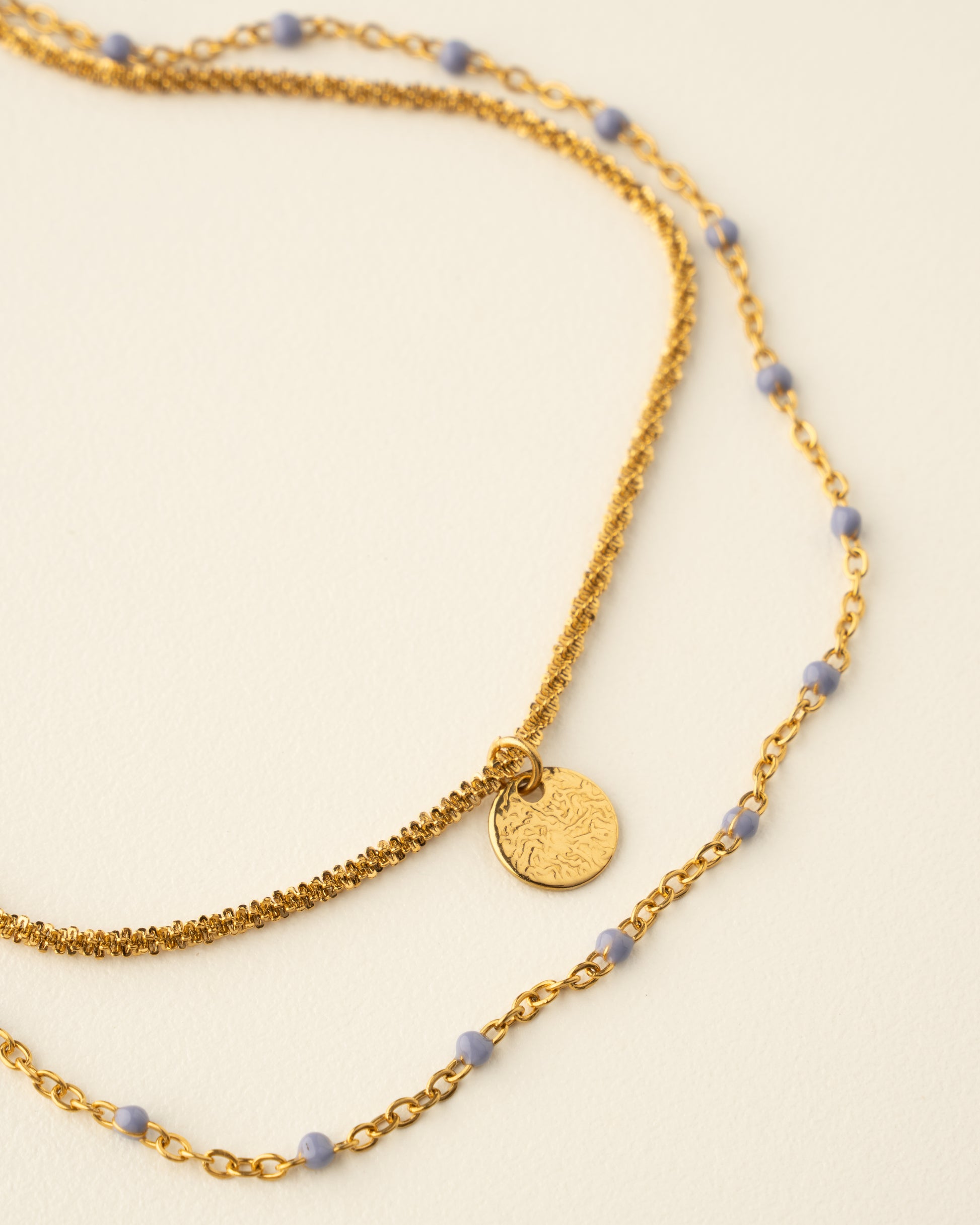 Elevate your style with this playful double-layer necklace featuring light purple beads and a round pendant. The 18k gold-plated stainless steel Cuban chain adds a touch of luxury while remaining durable for everyday wear. Ready to ship and ready to make your outfit pop with a splash of color and shine!