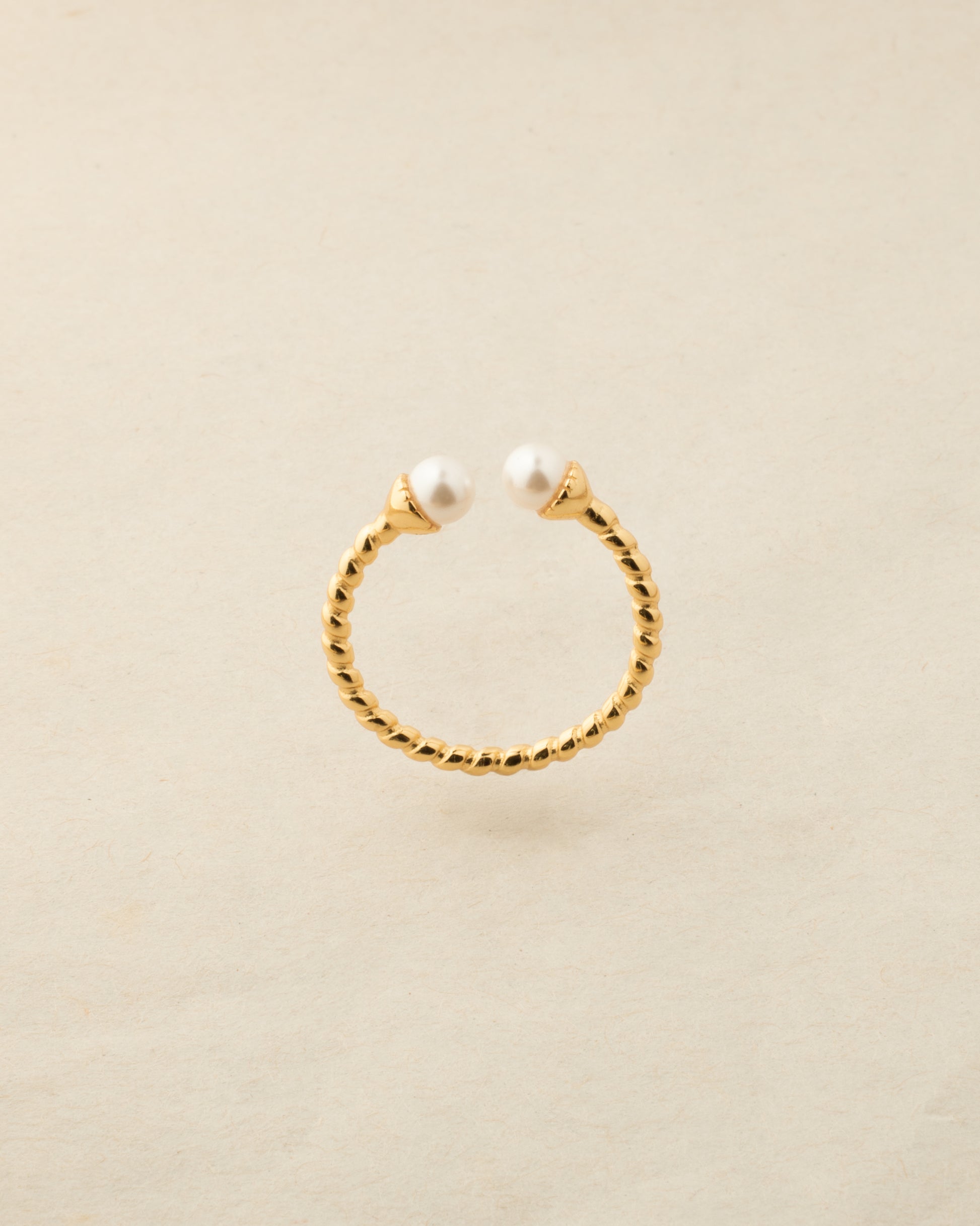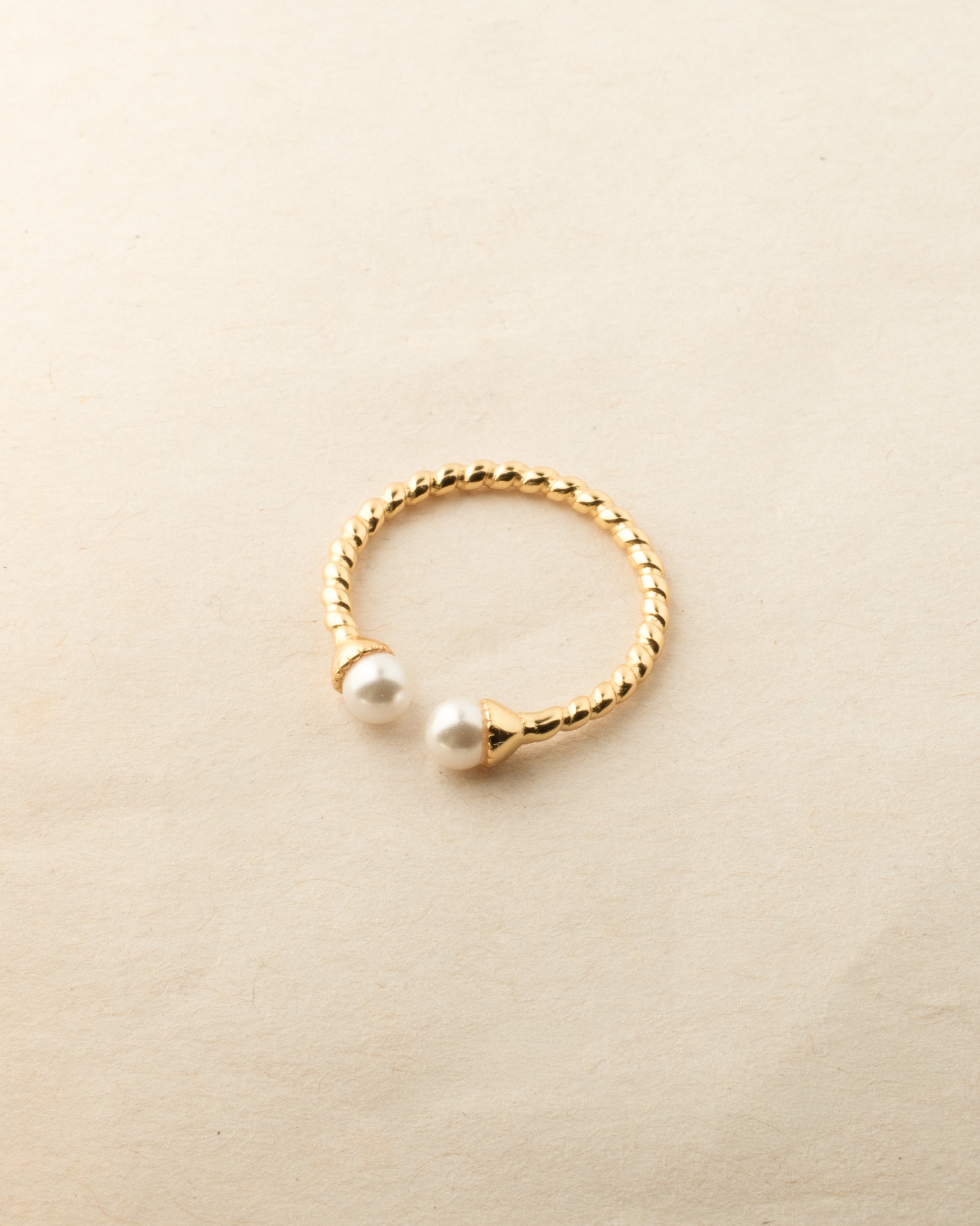Elegant vintage-style ring made from 925 sterling silver with 18K gold plating. Features a twisted band with pearl tips and an adjustable open design for a perfect fit. Ideal for bridal looks or classy everyday wear.
