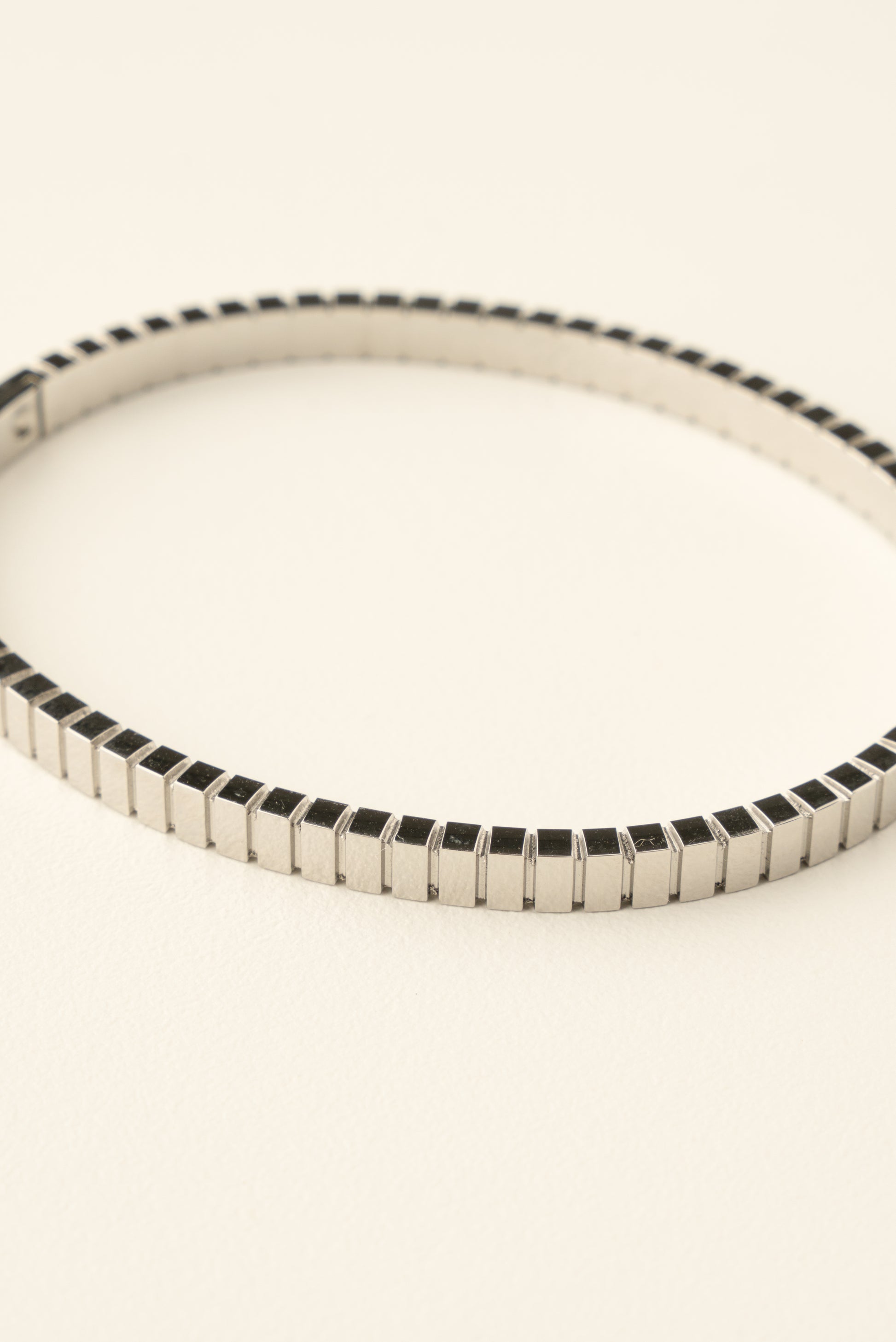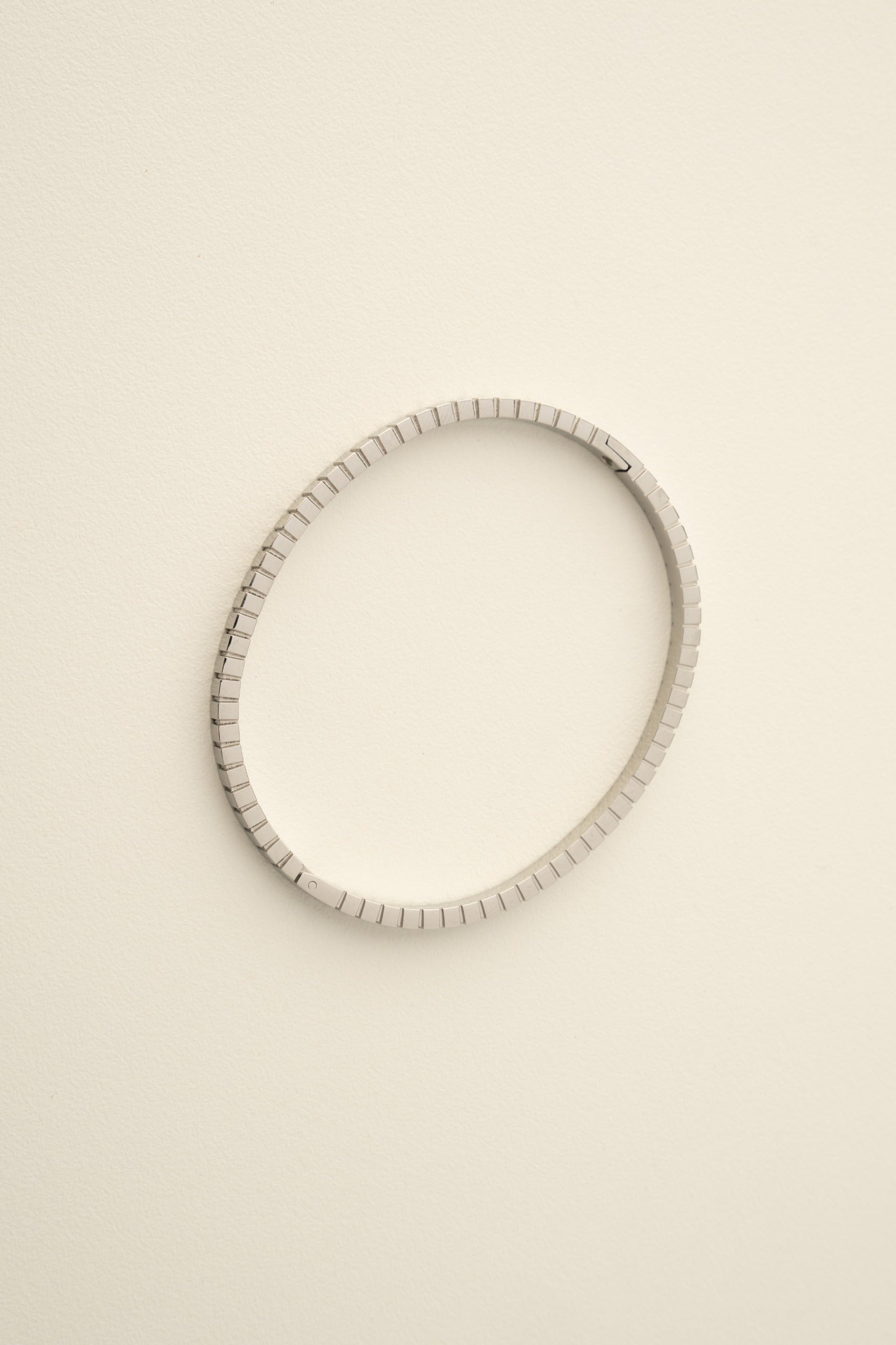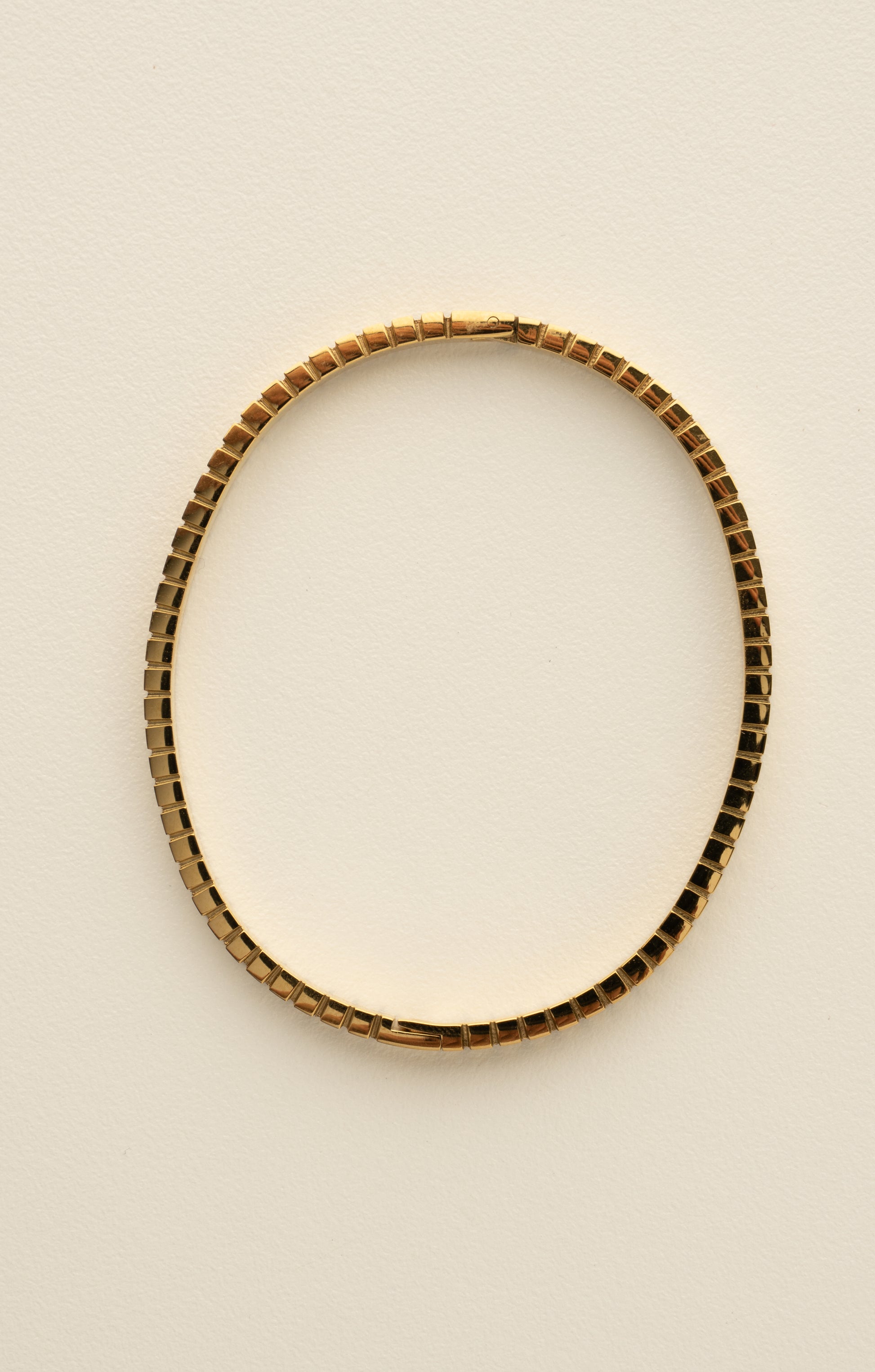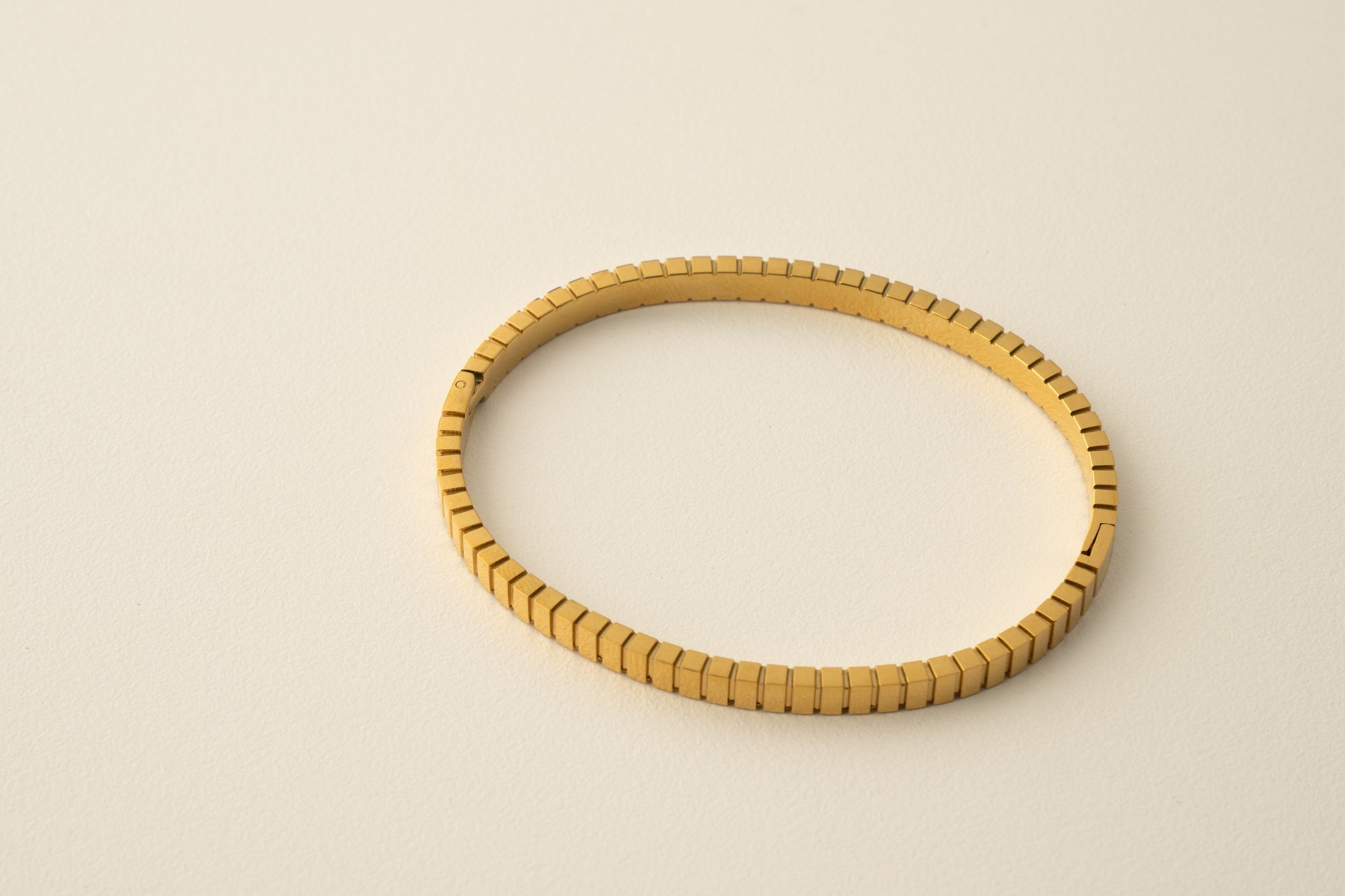 Meticulously crafted from superior stainless steel, this bangle bracelet features an architectural checked gear design enhanced by luxurious 18K PVD gold plating. The advanced PVD technology ensures exceptional durability, creating a waterproof and tarnish-resistant finish that maintains its brilliance indefinitely. The distinctive geometric pattern offers sophisticated versatility, transitioning seamlessly from professional settings to elegant evening occasions.