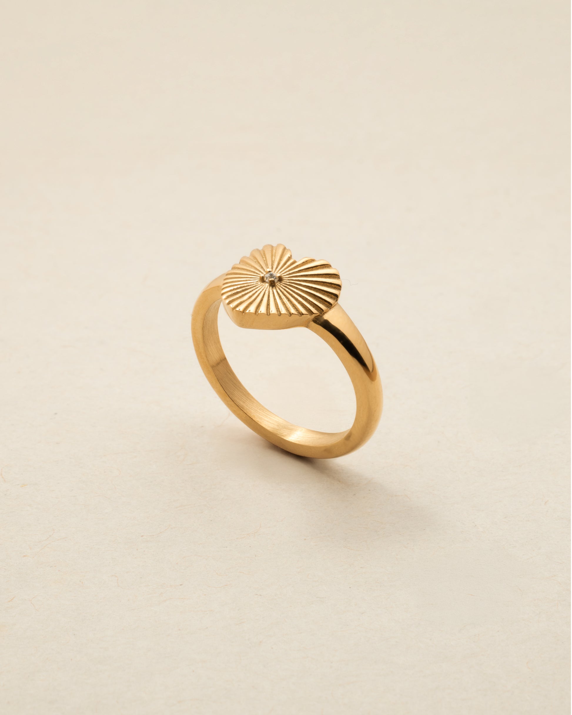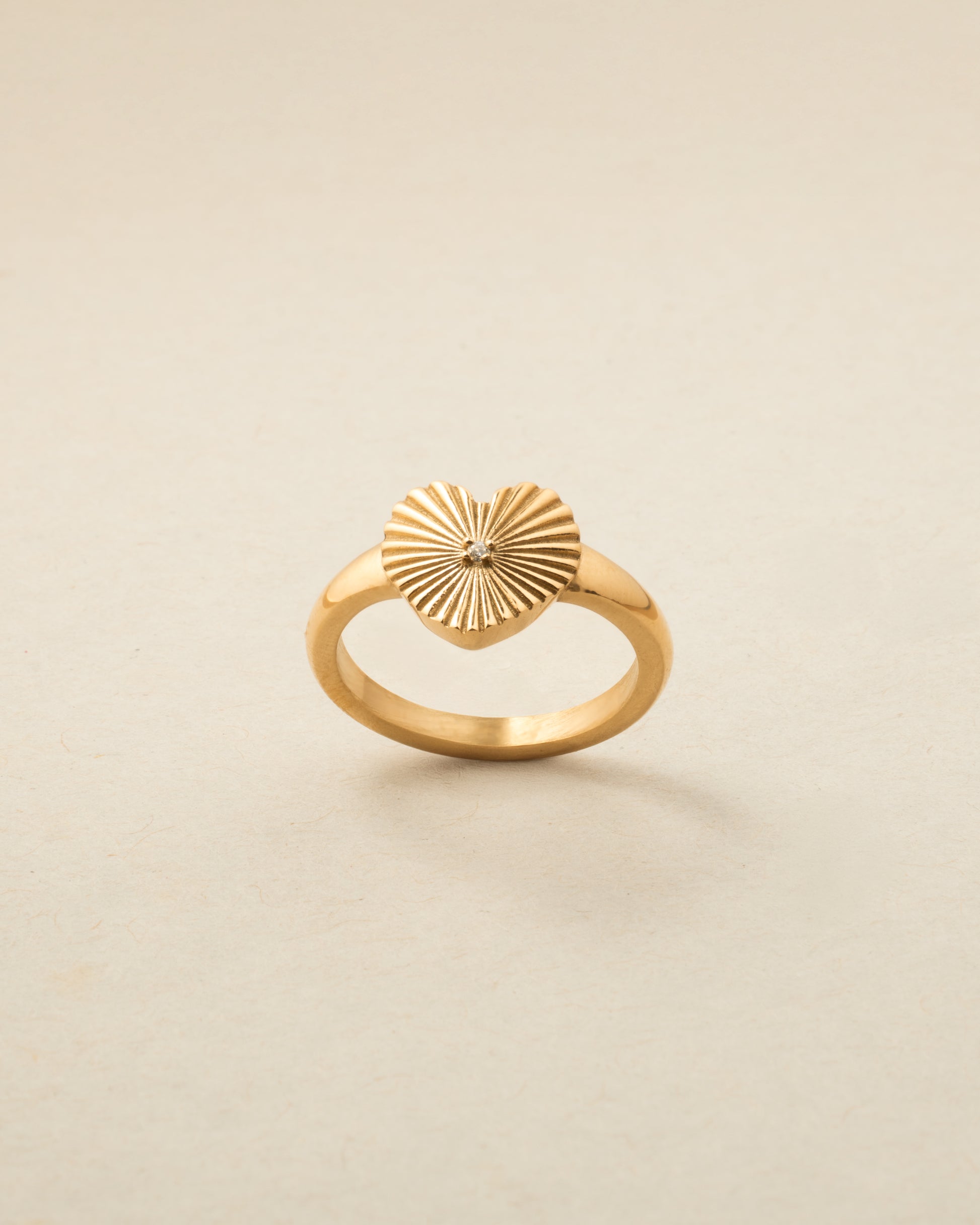 A radiant symbol of love and light, this heart-shaped ring features a sparkling cubic zirconia center wrapped in sunburst rays, crafted from 18K gold PVD-plated stainless steel for lasting brilliance, hypoallergenic comfort, and everyday elegance.